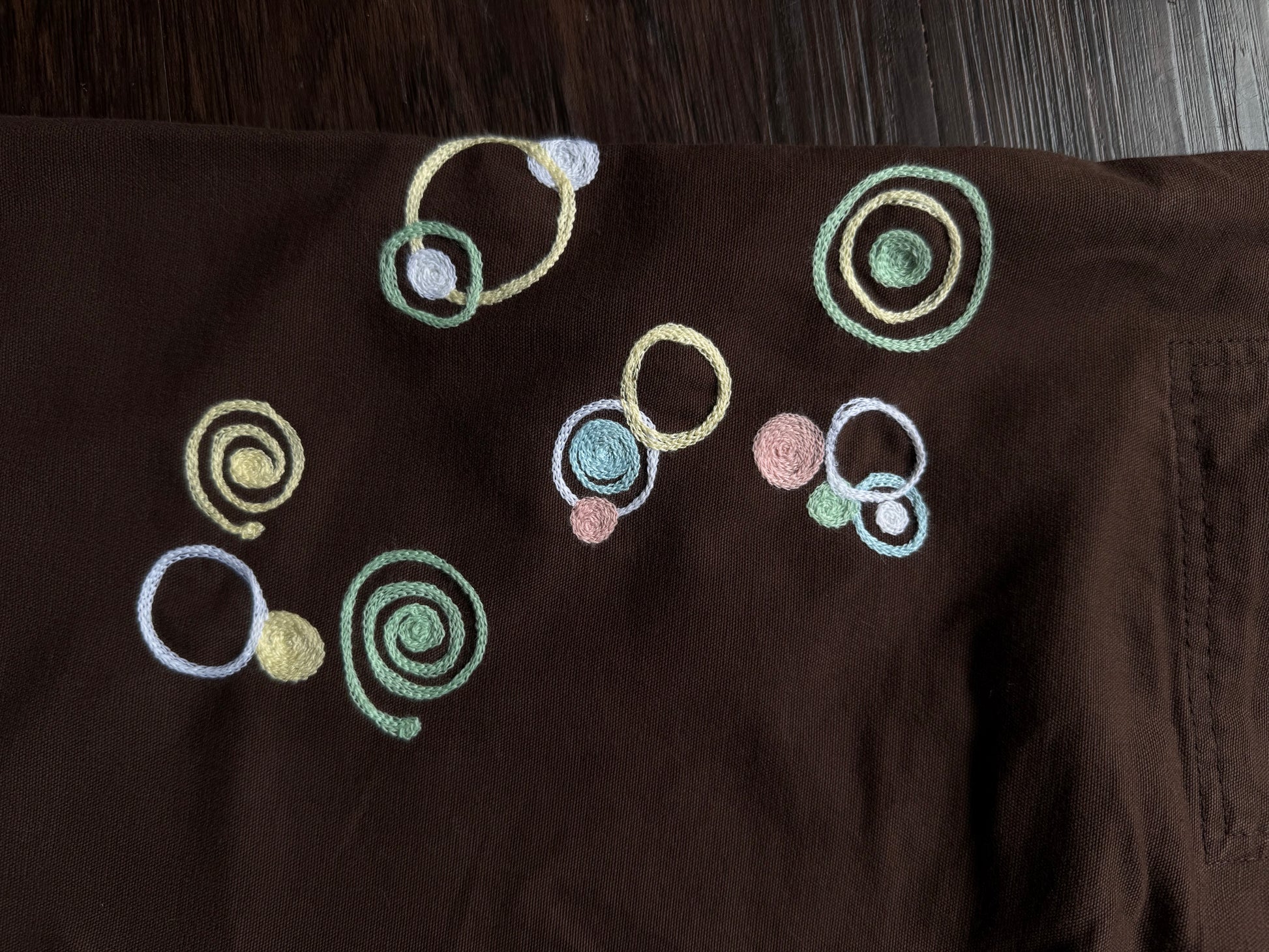 This garment originally had stains or holes that have now been covered with chain-stitch embroidery. The